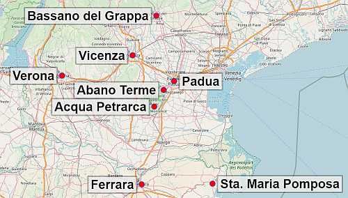Abano Terme, malerisch am Rande der Euganeischen Hügel in der Provinz Padua gelegen, ist seit der Römerzeit berühmt für seine warmen Heilquellen. Die hervorragende Lage des berühmten Badeorts erlaubt es uns, bequem Ausflüge in die an Kultur sehr reiche nähere Umgebung zu unternehmen. Da ist Acqua Petrarca oben in den Hügeln, wo der berühmte Gelehrte Petrarca seinen Lebensabend verbrachte. In Padua malte Giotto die Capella degli Scrovegni aus - ein Meisterwerk. Palladio baute in der näheren Umgebung 39 (!) Villen und Kirchen, heute ein Teil des UNESCO-Weltkulturerbes, wie z. B. die berühmte Basilica Palladiana in Vicenza. Verona glänzt mit einer schönen Altstadt, einem im Sommer bespielten Amphitheater und dem berühmtesten Liebespaar der Geschichte: Romeo und Julia. Ein erstes Beispiel moderner Stadtplanung finden wir in der Altstadt von Ferrara, dem Herrschaftssitz der Este. Lucrezia di Borgia fand hier einst späte Erfüllung als fürsorgliche Landesmutter. Die Abtei Sta. Maria Pomposa hatte ihre Blütezeit um das Jahr 1000 unter Kaiser Otto III. - sie glänzt noch heute mit frühmittelalterlichen Fresken und Mosaiken. Auch ohne das nahe Venedig eine kulturell vielseitige Region, in der auch ein guter Wein wächst, der zu Grappa verarbeitet wird.