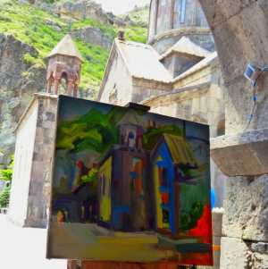 Junge Kunststudenten begeistern sich für die malerische Kulisse des Klosters Geghard. -